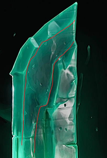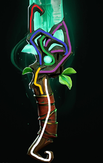 分析原图中武器的特征,推测其大概率是西方魔幻背景下,由自然祭司使用的匕首。刀身玉石材质,柄木质,上有红布缠绕,绿叶点缀,可分为四个部分制作。